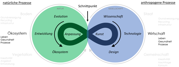 Gelingt diese Anpassung, übernimmt die Natur einen ökologischen Aufgabe, die mit der Anpassung an die Region, Vorteile an die Wirtschaft bereitstellt. Technologien können angepasst werden und unser Leben wächst mit der Natur zusammen. So schließt sich der Kreislauf, der einerseits die Gesellschaft zum Handeln animiert, um gleichzeitig von und mit der Natur zu leben.